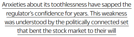 Anxieties about its toothlessness have sapped the regulator’s confidence for years. This weakness was understood by the politically connected set that bent the stock market to their will.