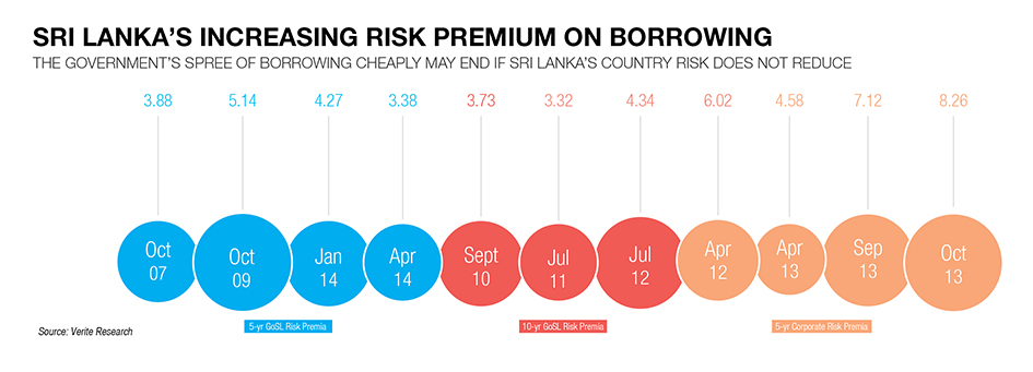 But the idea of being an education hub, for instance, is still a pipe dream. There is no sign of Sri Lanka proceeding in that path. Public investments in this area are too low. Reputation in education gets built around having very strong national universities and education institutes. Singapore and India have beaten us to it and Sri Lanka is not yet on a path that shows hope of catching up. In terms of an IT hub, it’s challenged because we just don’t have the labour force numbers to make us a mass IT services location. So we have to move into niche and high-end IT. Even our own IT companies migrate overseas, because Sri Lanka does not have the numbers. The multiple hub strategy sounds nice, it’s been on the books since the mid-90s. But it is only the logistics sector that is likely to show significant progress in that direction in the medium term.Sri Lanka has been boasting about the low interest rates at which it’s able to issue international bonds. You have to ask if we got lower interest rates because Sri Lanka is viewed as a less risky and reliable borrower, or because global interest rates are falling. The way to answer that is to look at the risk-free interest rate at the time the bonds were issued, and compare that against the bond price to figure the country risk. You can see that for 5-year bonds, in 2007, we have a country risk of 3.8%. As the war progressed, it went up, and post war it was at 3.3%, but still in the same ballpark as during the war years. On the 10-year bond, we started in 2010 at 3.73%, a good rate, and it came down to 3.32% in 2011, but went up to 4.34% in 2012. So you can see the sentiment changing a bit in the 10-year bonds. Government-controlled institutions are borrowing at high rates on the risk premium alone. Global rates are unlikely to fall from where they are now, it would seem that the only way is up. The US dollar is unlikely to fall further against other currencies over the medium term either. The spree of borrowing cheaply is going to end, unless Sri Lanka’s country risk reduces. It was probably a good move to borrow while rates were low. When rates are low, that’s the time to lock in. It’s disappointing that our risk premiums are so high, that we are unable to make the best of that opportunity. In 2012, risk free rates were at 1.27%, so paying a risk premium of 7% to borrow through government controlled entities really negates the benefit of the low rate. The inevitable increase in rates means that when we try to roll over debt, it’s not going to look less feasible than before. When looking one to two years ahead we need to do something new to maintain growth and bring stability.”