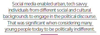 At the same time, we noted how the social media enabled urban, tech savvy individuals from different social and cultural backgrounds to engage in the political discourse. That was significant when considering many young people today to be politically indifferent.