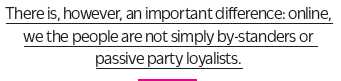 There is, however, an important difference: online, we the people are not simply by-standers or passive party loyalists. If we choose to exercise it, we have the power to question and even challenge our politicians.