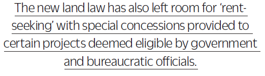 Lack of institutional independence and integrity, poor governance and law and order are the roadblocks. The new land law has also left room for ‘rent-seeking’ with special concessions provided to certain projects deemed eligible by government and bureaucratic officials.
